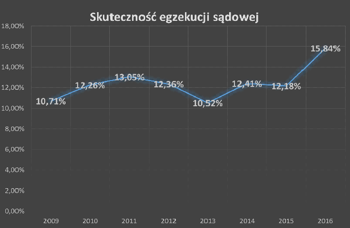 Z danych Krajowej Rady Komorniczej wynika, że w 2016 r. komornicy w Polsce wyegzekwowali na rzecz wierzycieli 8 mld 314 mln zł. Skuteczność kwotowa egzekucji sądowej w ubiegłym roku, w naszym kraju była na poziomie prawie 16%, co oznacza wzrost o 3,6 % r/r. To najlepszy wynik od czasu, kiedy prowadzone są pomiary tj. od 2009 r. Jednocześnie w ubiegłym roku do kancelarii komorniczych wpłynęło 4,5 mln spraw egzekucyjnych.
